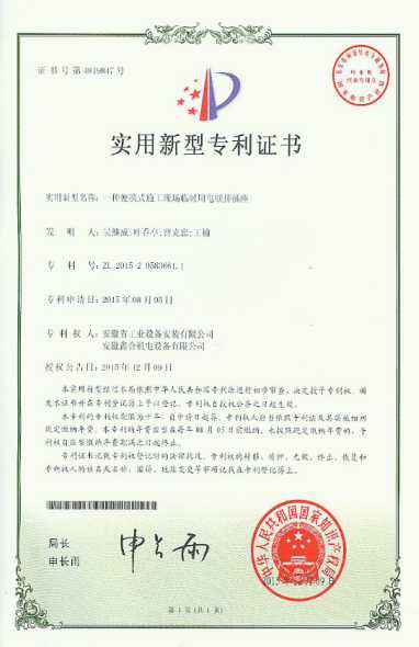 近日,從國家知識產權局傳來喜訊,公司申報的“一種便攜式施工現場臨時用電聯排插座”實用新型專利獲批,并頒發了國家實用新型專利證書。