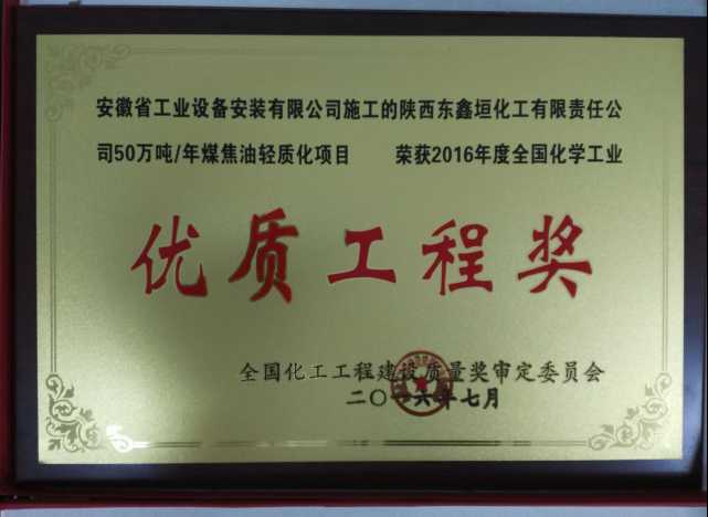 近日,從全國化學工程建設質獎審定委員會傳來喜訊,公司參建的陜西東鑫垣化工有限責任公司50萬噸/年煤焦油輕質化項目榮獲“2016年度全國化學工業優質工程獎”。