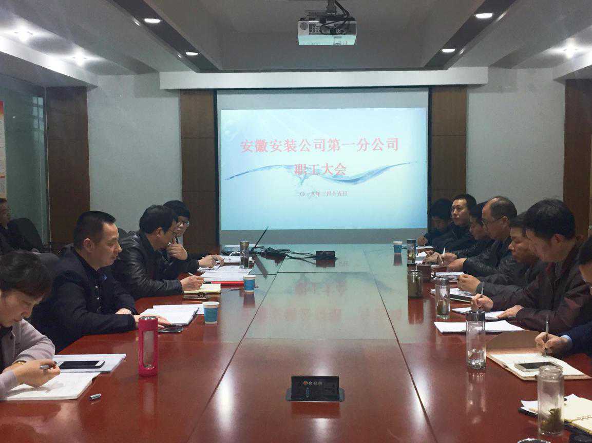 2018年3月15日,第一分公司在分公司機(jī)關(guān)召開(kāi)2017年度職工大會(huì)。公司黨委書記、副總經(jīng)理胡六中,紀(jì)委書記、工會(huì)主席李寬旭,人力資源部經(jīng)理王敏等出席了會(huì)議,分公司機(jī)關(guān)全體人員及在肥項(xiàng)目部員工共36人參加了會(huì)議。會(huì)議由第一分公司黨支部書記胡迎東主持。