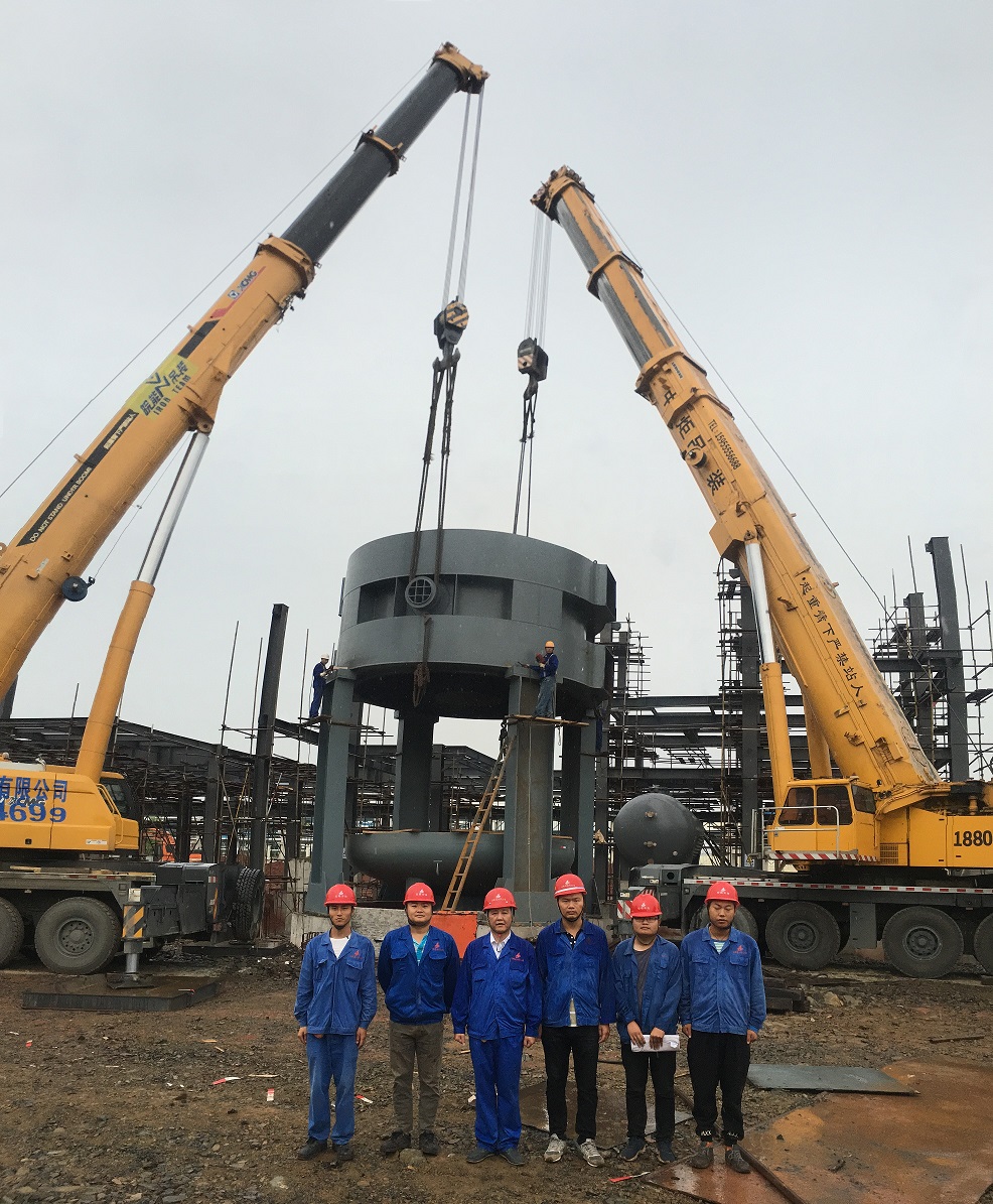 本次吊裝的反應(yīng)器中段部分重達(dá)220噸,分公司領(lǐng)導(dǎo)高度重視,吊裝前期,邀請(qǐng)公司總工吳繼成、總工辦主任牛守義和安全部王岳濤經(jīng)理親臨項(xiàng)目部參與設(shè)備吊裝的專題方案討論定稿工作。當(dāng)日上午,吊裝現(xiàn)場(chǎng)準(zhǔn)備工作緊張卻又有條不紊的進(jìn)行,項(xiàng)目經(jīng)理李子鳳向全體“參戰(zhàn)”員工進(jìn)行了安全交底,工作人員對(duì)兩臺(tái)分別為500T、350T吊車的站位及性能再次確認(rèn),現(xiàn)場(chǎng)機(jī)具、人員均按既定方案實(shí)施。分公司經(jīng)理史崇松、業(yè)主單位負(fù)責(zé)人、監(jiān)理全程在現(xiàn)場(chǎng)“督戰(zhàn)”,全體工作人員經(jīng)過四個(gè)小時(shí)的奮戰(zhàn),吊裝作業(yè)圓滿結(jié)束。