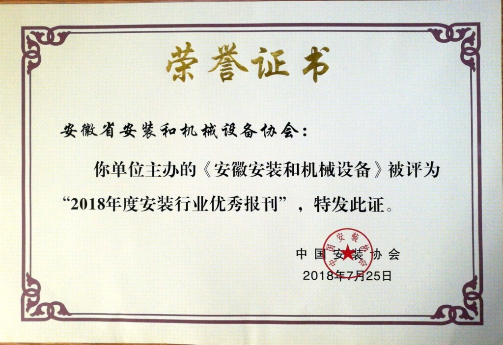 本次評(píng)選中,全國(guó)共5家行業(yè)協(xié)會(huì)獲得“優(yōu)秀期刊”稱號(hào),7家行業(yè)協(xié)會(huì)獲得“優(yōu)秀網(wǎng)站” 稱號(hào),協(xié)會(huì)主辦刊物《安徽安裝和機(jī)械設(shè)備》和網(wǎng)站名列其中,報(bào)刊主編李鵬飛、杜慶梅獲得“2018年度安裝行業(yè)優(yōu)秀主編”稱號(hào),網(wǎng)站建設(shè)者徐俊、黃世碰獲得“2018年度安裝行業(yè)網(wǎng)站建設(shè)先進(jìn)個(gè)人”稱號(hào)。安徽省工業(yè)設(shè)備安裝有限公司等單位獲得“優(yōu)秀網(wǎng)站” 稱號(hào)。表彰了先進(jìn),發(fā)揚(yáng)了成績(jī),希望會(huì)員單位向獲獎(jiǎng)單位學(xué)習(xí),認(rèn)真貫徹落實(shí)黨的十九大精神,不斷創(chuàng)新企業(yè)信息宣傳工作,為提升安徽企業(yè)發(fā)展和安裝行業(yè)信息宣傳工作進(jìn)步做出新的貢獻(xiàn)。