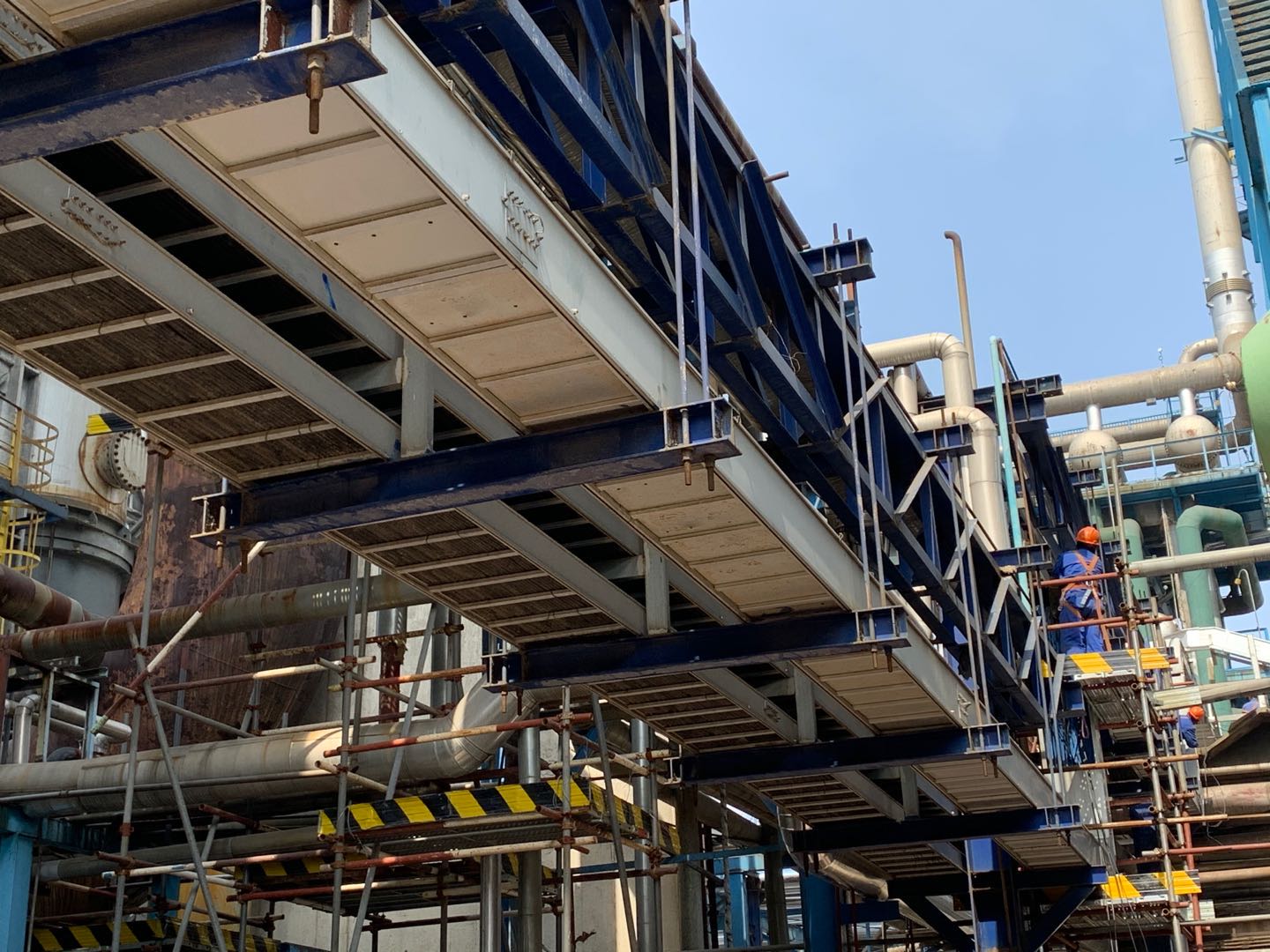 “腈綸阻燃纖維生產(chǎn)技術(shù)改造項(xiàng)目”的建成能夠使纖維產(chǎn)品起到防火阻燃的作用,創(chuàng)造更大經(jīng)濟(jì)效益,該項(xiàng)目屬于安慶石化重點(diǎn)項(xiàng)目。項(xiàng)目在施工過(guò)程中,由于安裝場(chǎng)地位于室內(nèi),運(yùn)輸和起重機(jī)械無(wú)法使用,導(dǎo)致2臺(tái)12噸、2臺(tái)8噸的配料罐無(wú)法簡(jiǎn)便運(yùn)輸和吊裝進(jìn)入室內(nèi)安裝,給施工人員造成極大的困擾。但方法總比困難多,經(jīng)項(xiàng)目部拿出具體施工方案與業(yè)主、監(jiān)理研究決定,利用最原始的滾杠搬運(yùn)辦法,再以原有房梁為吊點(diǎn),采用2個(gè)20噸手動(dòng)葫蘆吊裝、拉運(yùn)的方式順利將設(shè)備安裝就位。同時(shí)項(xiàng)目部合理安排人員加班加點(diǎn),為后期機(jī)泵安裝及工藝管道、鋼結(jié)構(gòu)、電氣儀表、防腐保溫等配套設(shè)施施工爭(zhēng)分奪秒,力爭(zhēng)3月31日完成共混單元所有施工,為業(yè)主平穩(wěn)生產(chǎn)產(chǎn)品,創(chuàng)造效益打下堅(jiān)實(shí)基礎(chǔ),也為安徽安裝的發(fā)展打下良好的口碑。