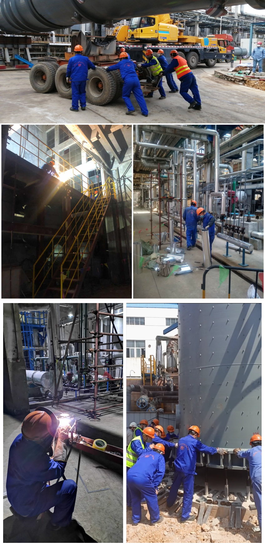 “Ⅰ、Ⅱ硫磺回收裝置增設(shè)煙氣后堿洗流程項(xiàng)目”是能使煙氣SO2排放濃度從原先的50mg/m3下降至≤10mg/m3的環(huán)保工程。但該項(xiàng)工程僅一個(gè)脫硫塔下段就高達(dá)33米,重達(dá)58噸,體積十分龐大,而現(xiàn)場(chǎng)存在作業(yè)場(chǎng)地狹小,固有障礙物多、吊重荷載大等諸多問(wèn)題,無(wú)法將設(shè)備一次性運(yùn)至施工現(xiàn)場(chǎng)并進(jìn)行下段焊接梯子、平臺(tái)等附塔“穿衣戴帽”作業(yè)。對(duì)此,項(xiàng)目部多次優(yōu)化倒運(yùn)方案,提前合理部署,采用額定荷載分別為220噸和90噸的汽車吊實(shí)施雙機(jī)抬吊作業(yè)和專為公路橋梁設(shè)計(jì)使用的炮車運(yùn)輸,從而順利完成了倒運(yùn)工作。同時(shí),為爭(zhēng)取時(shí)間,安排班組實(shí)行夜間倒班制,管理人員輪班制,為接下來(lái)的脫硫塔“穿衣戴帽”和上下段空中組對(duì)焊接作業(yè)爭(zhēng)取了寶貴時(shí)間。