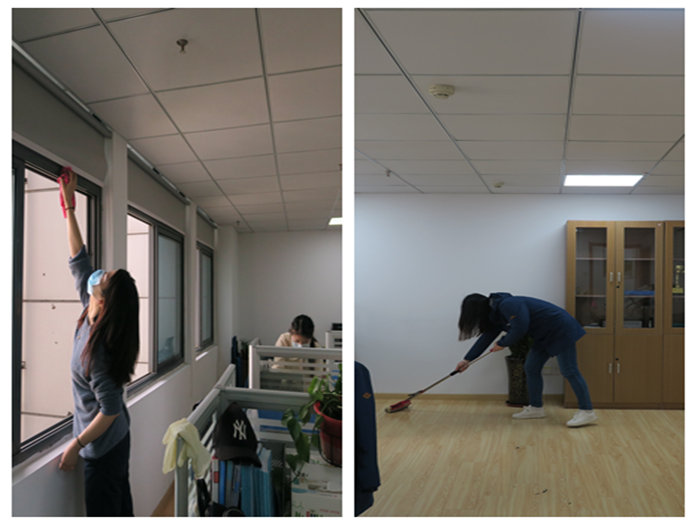 風和日麗,大家早早的來到辦公室,三五一組,相互配合,擼起袖子加油干。開窗通風、地面清掃、消毒殺菌、門窗擦拭、書柜整理、綠植澆灌、垃圾傾倒……大家熱情高漲、干勁十足,仔仔細細清理著每個角落,不遺漏任何一個死角。經(jīng)過半個多小時的辛勤勞動,辦公區(qū)域頓時變得更加清新明亮、干凈整潔,不由得令人耳目一新、賞心悅目。隨后,分公司文明衛(wèi)生檢查組還對各部門的衛(wèi)生情況進行了嚴格打分,并對檢查結(jié)果進行了通報。