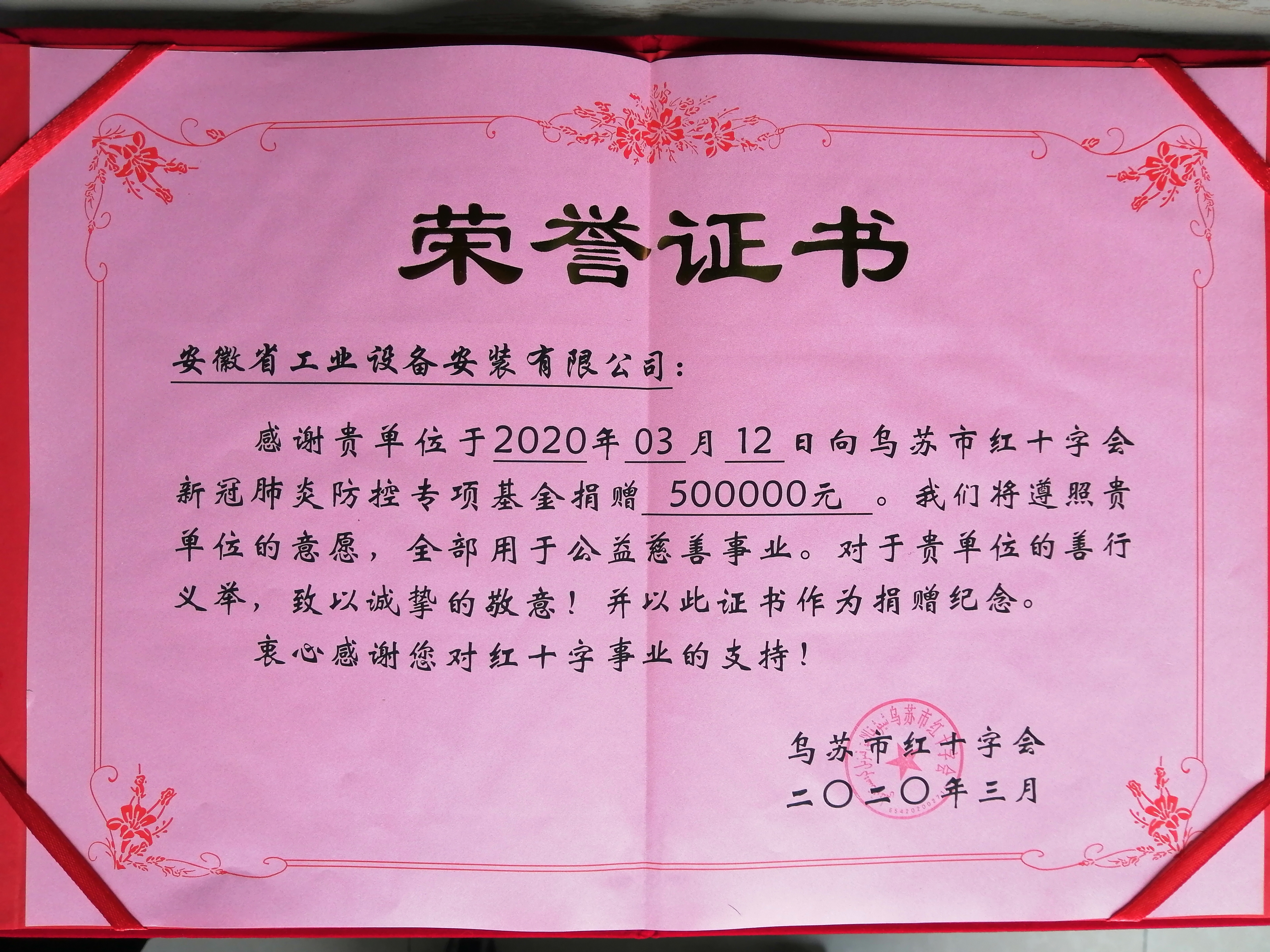 3月12日,安徽安裝公司向新疆烏蘇市紅十字會捐款50萬元,助力打贏疫情防控阻擊戰。