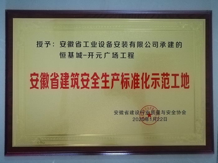 近日,安徽安裝承建的淮北恒基城開元廣場項目榮獲“安徽省建筑安全生產(chǎn)標準化示范工地”稱號,為公司在安全生產(chǎn)方面樹立了良好的企業(yè)形象。