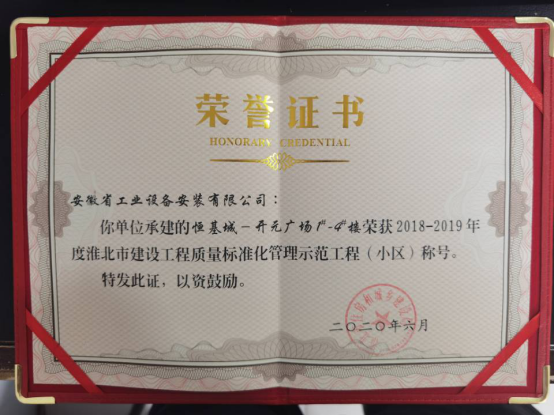 近日,安徽安裝公司承建的淮北恒基城開(kāi)元廣場(chǎng)項(xiàng)目工程榮獲“2018--2019年度淮北市建設(shè)工程質(zhì)量標(biāo)準(zhǔn)化管理示范工程(小區(qū))”稱號(hào)。