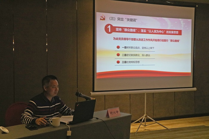 胡六中在報告中帶領大家共同回顧了習近平總書記考察安徽行程路線和重要講話精神,他指出,總書記在考察中多次提到“要牢固樹立以人民為中心的發展思想”“要踐行黨的宗旨,樹牢群眾觀點”“要多謀民生之利、多解民生之憂”,全體黨員領導干部一要從改進工作作風開始用行動踐行“群眾路線”,落實“以人民為中心”的發展思想;二要堅持“黨管干部”,全面深化干部制度改革;三要堅持“一體化”和“高質量”,推動黨建與生產經營深度融合。