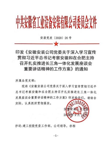 一是公司黨委迅速嚴(yán)密部署學(xué)習(xí)宣傳貫徹各項(xiàng)工作。9月8日,公司黨委理論中心組率先帶頭,認(rèn)真學(xué)習(xí)重要講話精神,深刻交流研討。9月14日,安徽安裝公司黨委下發(fā)《關(guān)于深入學(xué)習(xí)宣傳貫徹習(xí)近平總書記考察安徽和在合肥主持召開扎實(shí)推進(jìn)長三角一體化發(fā)展座談會重要講話精神的工作方案》,結(jié)合公司實(shí)際,精心嚴(yán)密部署“大學(xué)習(xí)”“大宣傳”“大貫徹”和“大落實(shí)”工作,確保公司上下人人都學(xué)習(xí),人人都領(lǐng)會。