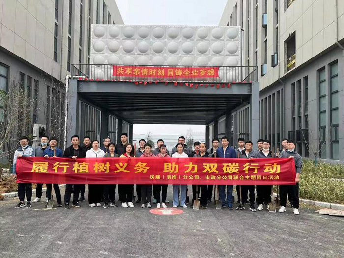 3月14日上午,房建(裝飾)分公司團支部聯合市政分公司團支部共同開展“履行植樹義務,助力雙碳行動”主題義務植樹活動,分公司黨支部書記攜團員青年等30余人參加活動。