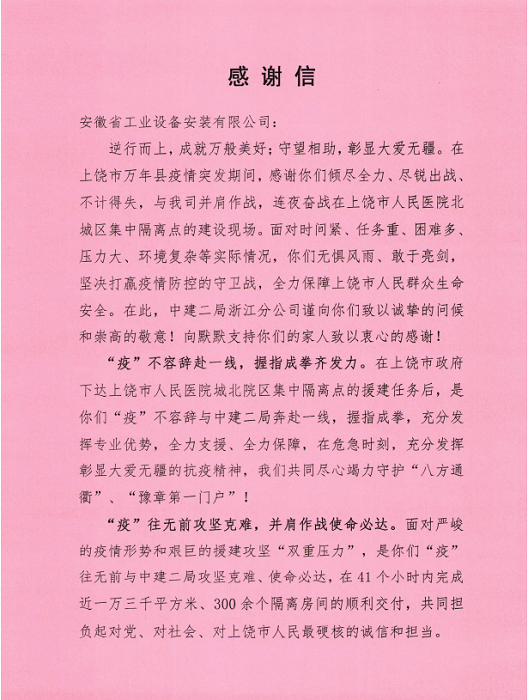 近日,安徽安裝公司收到來自中共中建二局浙江分公司委員會(huì)的一封感謝信,這是安徽安裝公司參加援建項(xiàng)目以來收到的第2封感謝信。