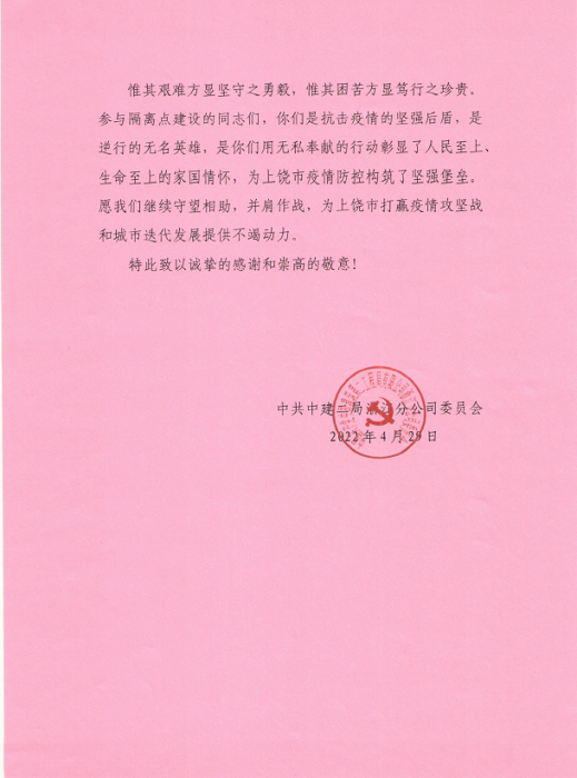信中對(duì)安徽安裝公司與中建二局浙江分公司共同援建上饒市人民醫(yī)院北城區(qū)集中隔離點(diǎn)給予高度的肯定和認(rèn)可。當(dāng)前,新冠疫情形勢嚴(yán)峻,安徽安裝公司在嚴(yán)格落實(shí)屬地疫情防控措施的同時(shí),一方面積極參與本地區(qū)隔離點(diǎn)、醫(yī)院發(fā)熱門診的緊急建設(shè)任務(wù);另一方面攜手相關(guān)行業(yè)兄弟單位同心協(xié)力、援建市外防疫區(qū)域,承擔(dān)起國有企業(yè)社會(huì)責(zé)任,竭盡所能地為防疫建設(shè)貢獻(xiàn)最大的力量!