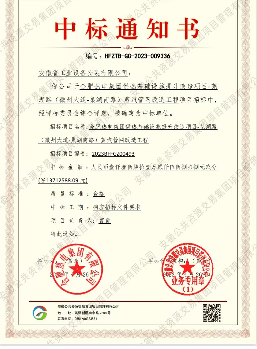 近日,安徽安裝市政分公司收到安徽公共資源交易平臺(tái)發(fā)來的中標(biāo)通知書,成功中標(biāo)合肥熱電集團(tuán)供熱基礎(chǔ)設(shè)施提升改造項(xiàng)目-蕪湖路(徽州大道-巢湖南路)蒸汽管網(wǎng)改造工程,中標(biāo)金額1371.25萬元。