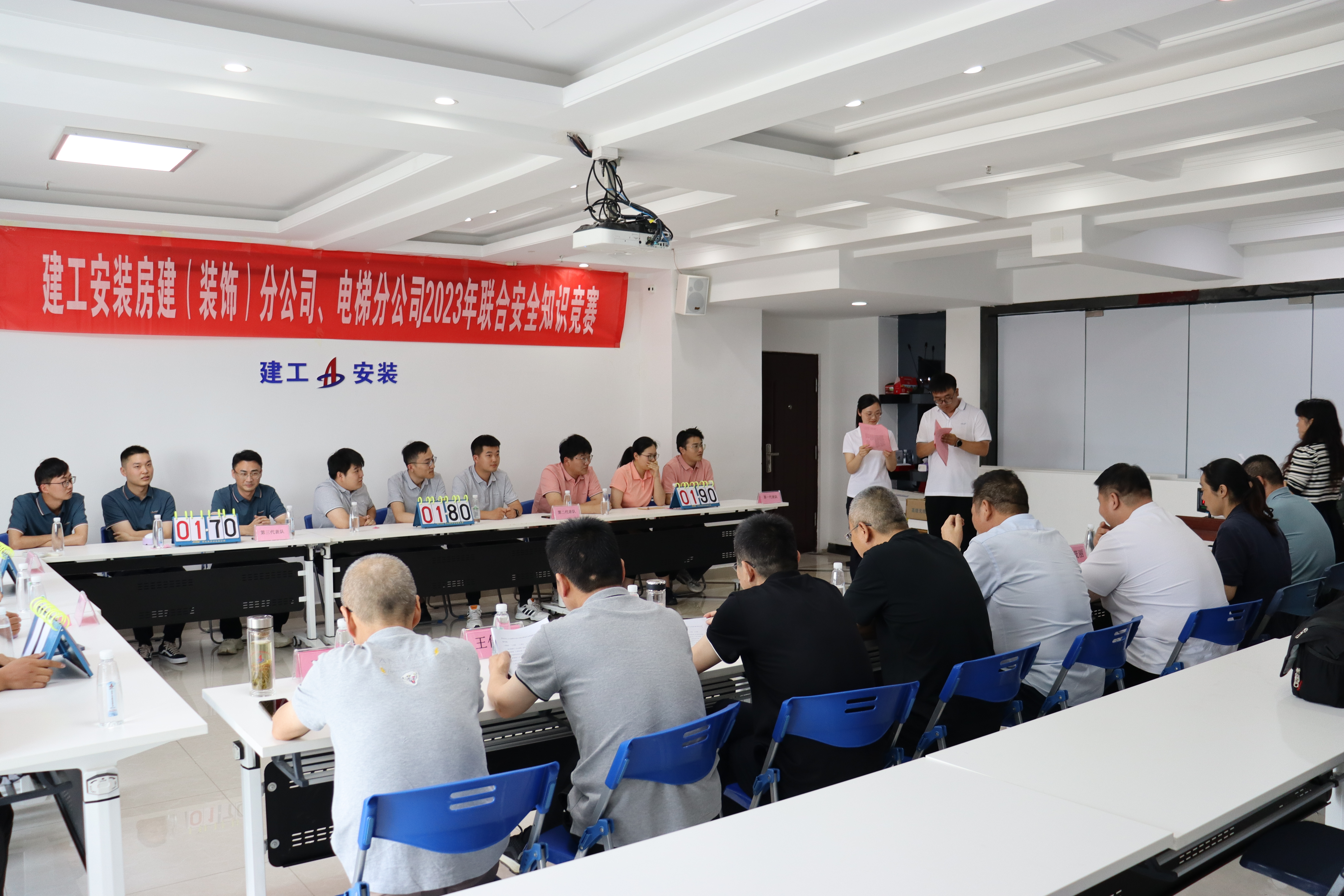 本次競賽房建(裝飾)分公司、電梯分公司共計5支代表隊參賽。競賽題型分為個人必答題、小組必答題、搶答題及冒險題四個環(huán)節(jié)。整個競賽過程氛圍活躍、精彩紛呈,經(jīng)過一個半小時的角逐,最終房建分公司機關(guān)代表隊獲得本次競賽冠軍。