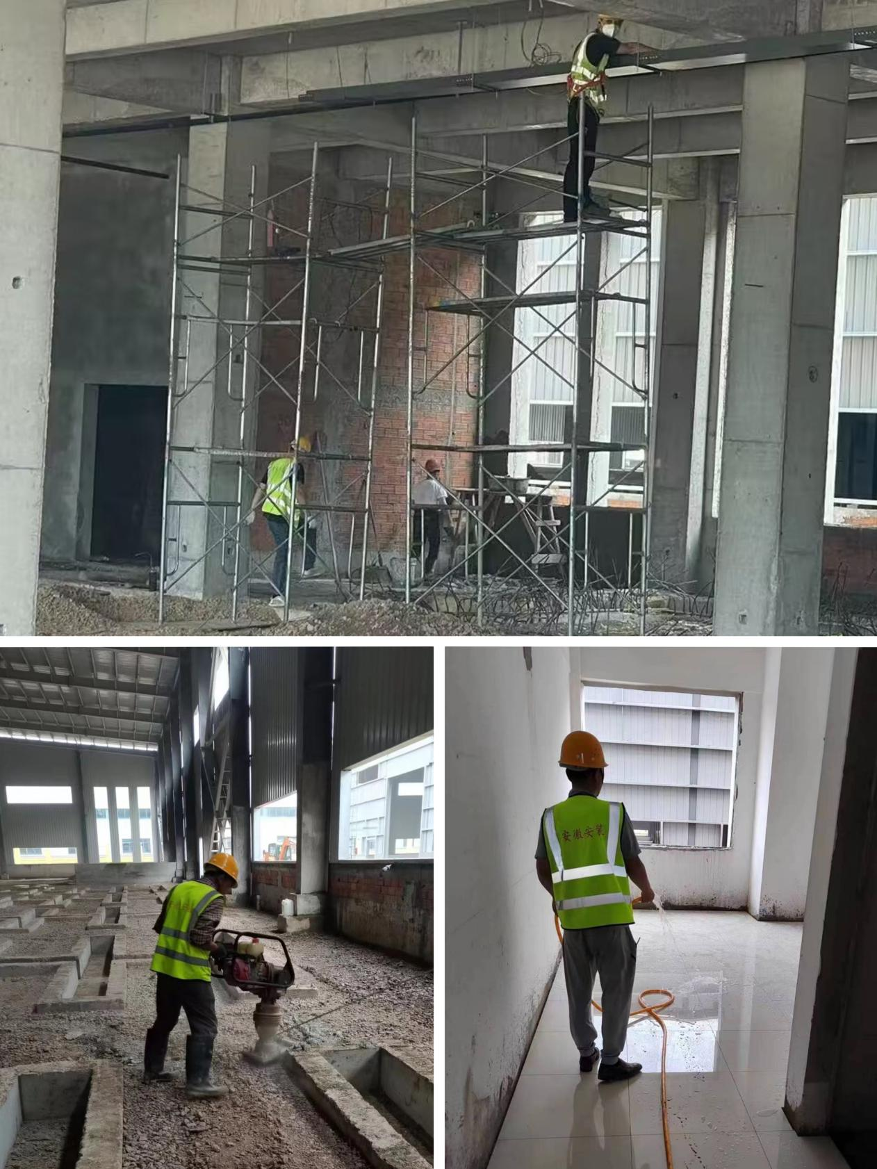 肥西安信立士項目現(xiàn)場正在進(jìn)行地基夯實、橋架安裝、瓷磚灑水養(yǎng)護(hù)