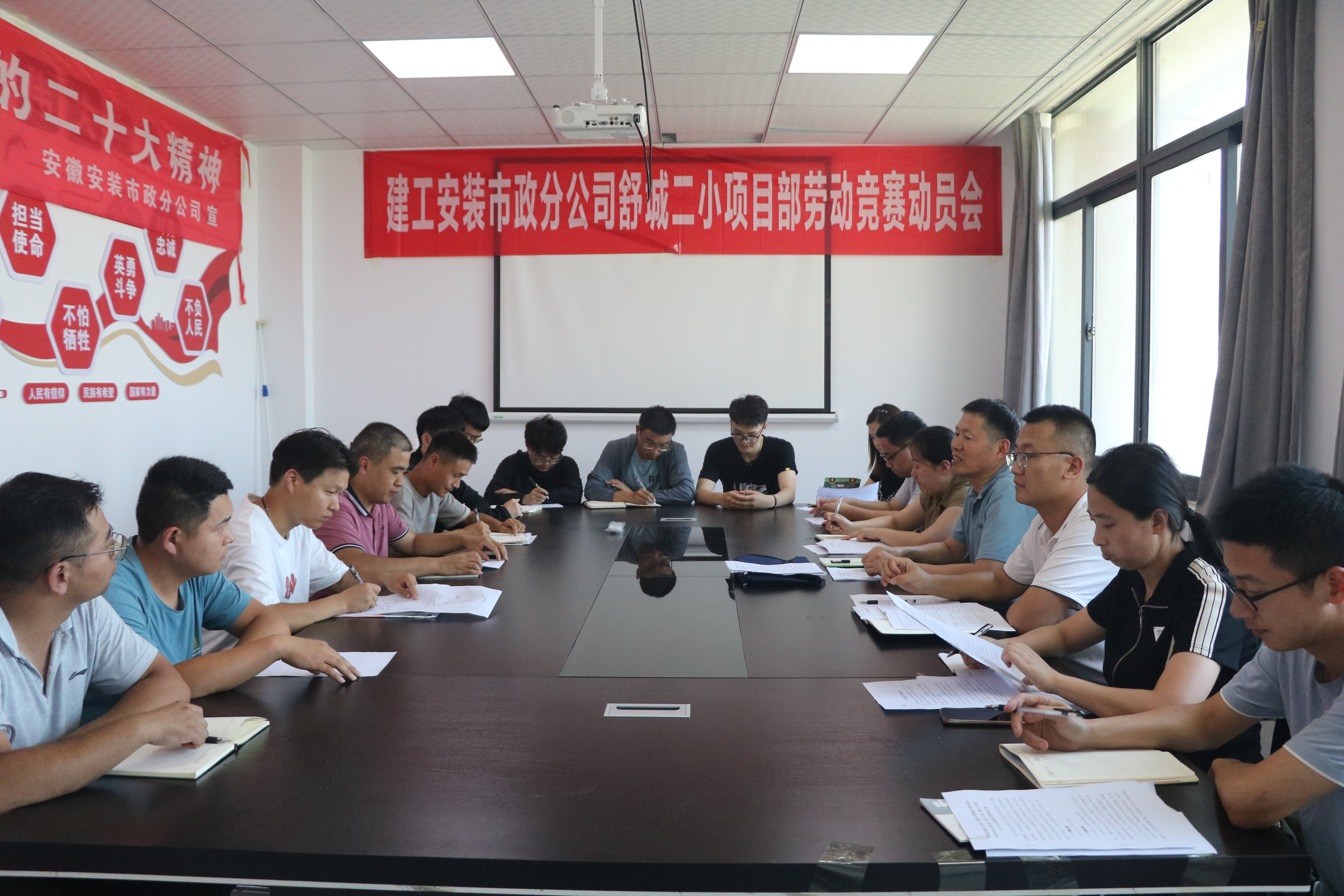 會(huì)上,項(xiàng)目部介紹了工程最新進(jìn)展情況,按照總包方要求,本項(xiàng)目要在7月30日前完成所有工程任務(wù)并達(dá)到通電驗(yàn)收條件;為全力以赴搶工期、保現(xiàn)場(chǎng),分公司立即在項(xiàng)目部組織開(kāi)展一次勞動(dòng)競(jìng)賽活動(dòng)。分公司工會(huì)副主席張曼在會(huì)上首先宣讀了舒城二小勞動(dòng)競(jìng)賽方案,與會(huì)人員對(duì)照方案內(nèi)容,從勞動(dòng)競(jìng)賽如何開(kāi)展,如何提質(zhì)增效、創(chuàng)新競(jìng)賽方式、推進(jìn)新技術(shù)成果應(yīng)用,如何大力弘揚(yáng)勞模精神、勞動(dòng)精神、工匠精神以掀起競(jìng)賽熱潮,如何運(yùn)用勞動(dòng)競(jìng)賽平臺(tái)培養(yǎng)和鍛煉項(xiàng)目管理人才等方面展開(kāi)積極討論,進(jìn)一步完善勞動(dòng)競(jìng)賽活動(dòng)方案。