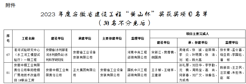 7月25日,安徽省住房和城鄉(xiāng)建設(shè)廳 、安徽省交通運(yùn)輸廳、安徽省水利廳聯(lián)合發(fā)布《關(guān)于公布2023年度安徽省建設(shè)工程“黃山杯”獎獲獎項(xiàng)目名單的通知》,由建工安裝集團(tuán)蚌埠分公司承建的“淮河試驗(yàn)研究中心(水工河工模型試驗(yàn)廳)一期工程”和參建的“安徽中煙工業(yè)有限責(zé)任公司阜陽卷煙廠易地技術(shù)改造項(xiàng)目1#聯(lián)合工房”等2個項(xiàng)目均獲2023年度安徽省建筑行業(yè)建設(shè)工程質(zhì)量最高榮譽(yù)獎“黃山杯”。其中“淮河試驗(yàn)研究中心(水工河工模型試驗(yàn)廳)一期工程”是建工安裝公司首次作為承建單位獲此殊榮;“安徽中煙工業(yè)有限責(zé)任公司阜陽卷煙廠易地技術(shù)改造項(xiàng)目1#聯(lián)合工房”項(xiàng)目同時正在申報國家級安裝行業(yè)最高獎項(xiàng)中國安裝工程優(yōu)質(zhì)獎(安裝之星),5月份預(yù)檢已通過,等待9月復(fù)檢。兩個項(xiàng)目作為承建和參建單位一舉捧得2樽“黃山杯”,也是蚌埠分公司歷史首次,同時也是蚌埠分公司近年來捧得的第5、第6樽“黃山杯”獎項(xiàng)。