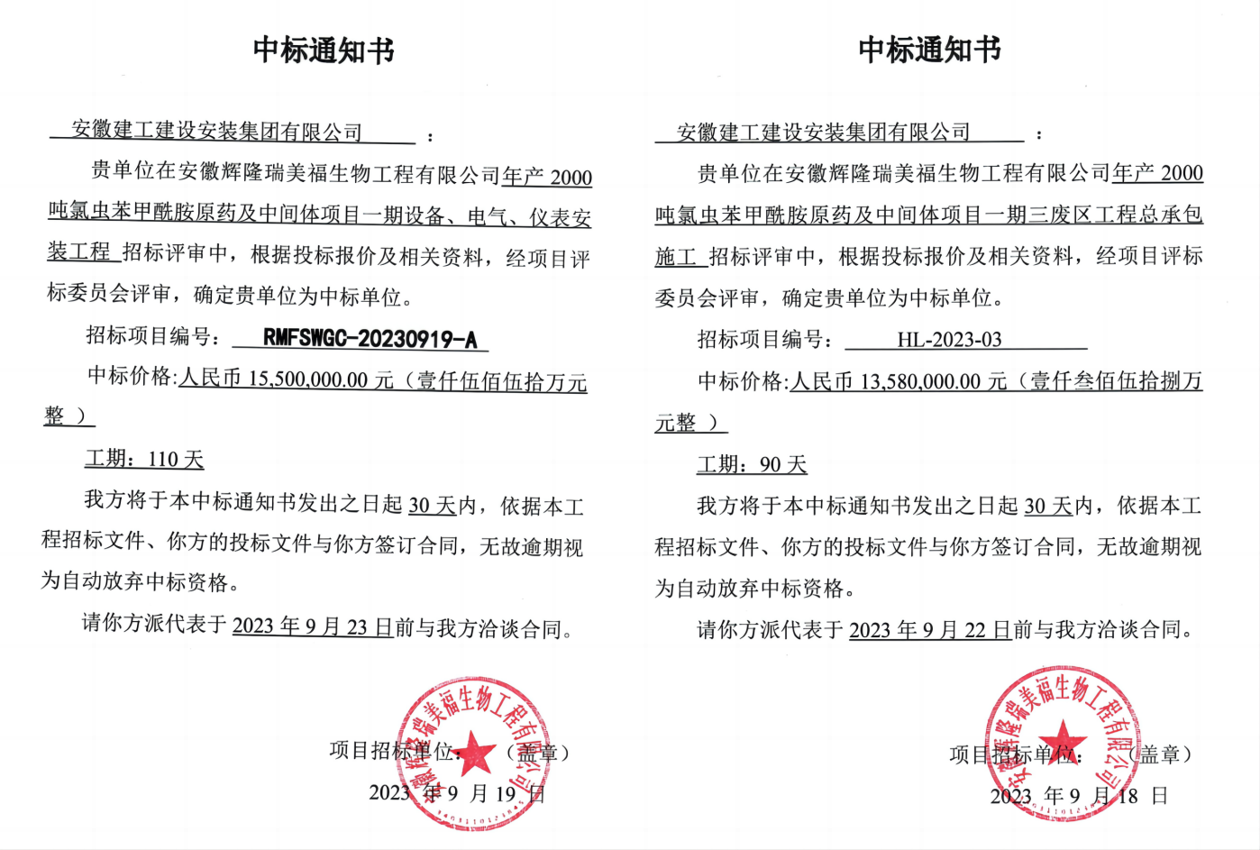 喜訊連連!建工安裝蚌埠分公司在本月連續(xù)中標安徽輝隆瑞美福生物工程有限公司年產(chǎn)2000噸氯蟲苯甲酰胺原藥及中間體項目一期三廢區(qū)總承包及設備安裝工程,合計中標金額2908萬元。分公司前期已中標并施工該項目一、二標段,目前已累計中標四個標段,合計中標金額達1.55億元,至此,輝隆一期經(jīng)營工作圓滿達到預期目標。
