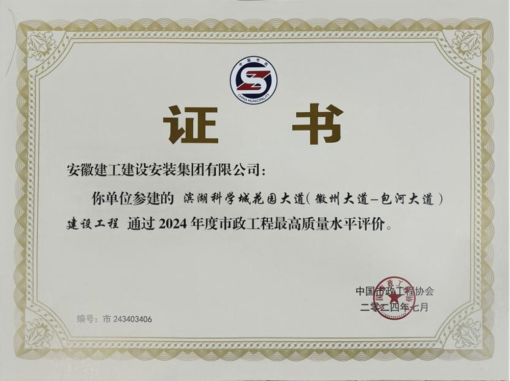 近日,中國(guó)市政工程協(xié)會(huì)頒發(fā)了2024年度市政工程最高質(zhì)量水平評(píng)價(jià)獎(jiǎng)證書,建工安裝合肥分公司濱湖科學(xué)城花園大道(徽州大道-包河大道)建設(shè)工程項(xiàng)目榮獲市政工程最高質(zhì)量水平評(píng)價(jià)獎(jiǎng),這是本項(xiàng)目繼榮獲“華東優(yōu)質(zhì)安裝工程獎(jiǎng)”、“黃山杯”之后的又一國(guó)家級(jí)獎(jiǎng)項(xiàng)。