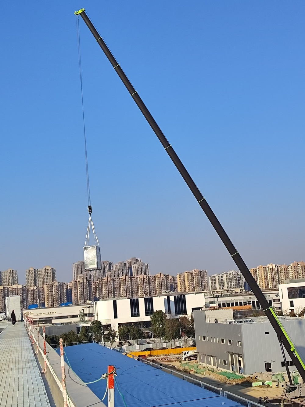 近日,車間一大型設(shè)備組合式空調(diào)陸續(xù)到貨,項目部有序開展組合式空調(diào)現(xiàn)場吊裝工作。為了確保吊裝工作的順利進行,項目部多次召開方案實施推進會,根據(jù)設(shè)備到場計劃,結(jié)合天氣情況、進場路線、現(xiàn)場站位、部件起吊等反復優(yōu)化吊裝方案。梳理工作清單、制定工作任務、責任落實到人。同時采用現(xiàn)場拉設(shè)警戒區(qū)域、現(xiàn)場作業(yè)交底、試吊、全程看護作業(yè)等方式,保障現(xiàn)場吊裝作業(yè)安全進行。
