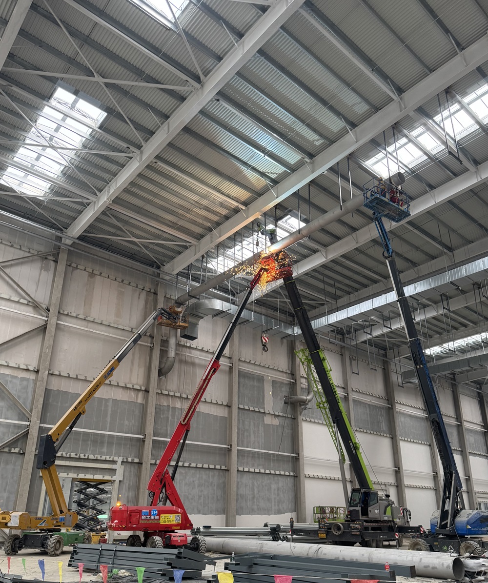 為確保施工有序高效運行,項目部嚴格按照總體工期計劃部署施工任務,加大人力、材料、機械投入,組織多個工作面同時展開施工,確保工程各節(jié)點進度有效推進。截至目前,沖壓車間架空循環(huán)水主管道已安裝完成進入介質(zhì)間。車間一閣樓空調(diào)水主管安裝完成3600米,管道風機安裝65臺,組空安裝4臺,閣樓配電房移交3個,配電柜安裝90臺,橋架安裝1500米,電線電纜安裝10000余米,各種燈具安裝200盞,消防報警設(shè)備安裝160套。