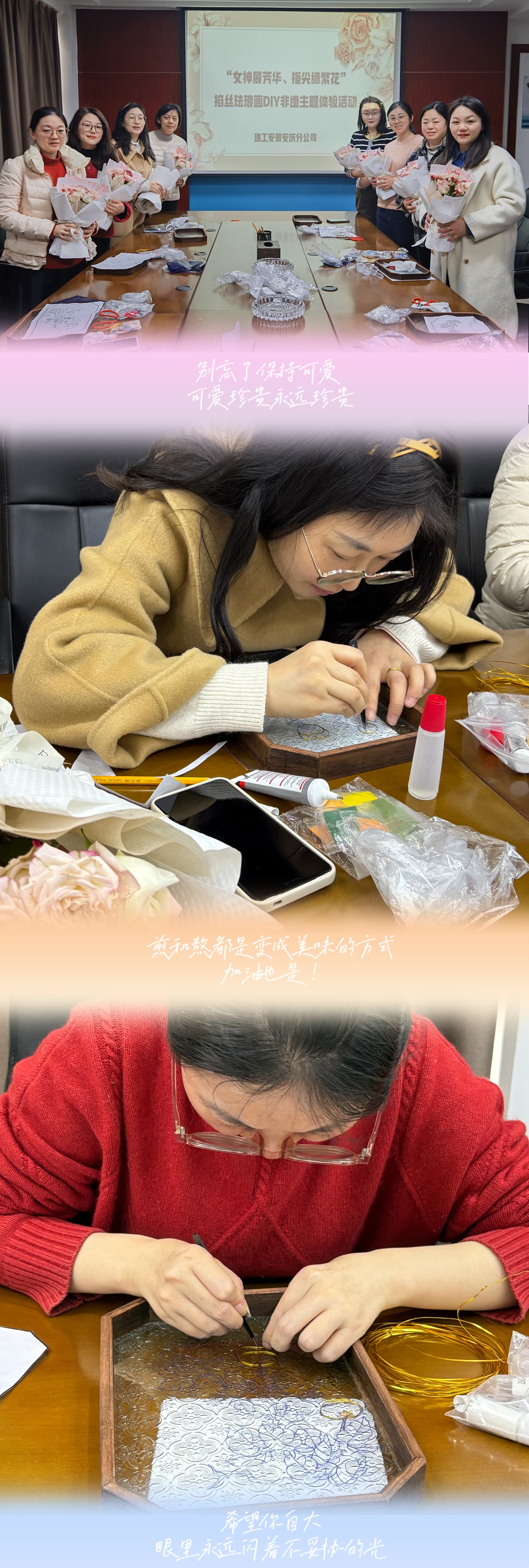 一年一度春風(fēng)暖,如詩如畫三月天。在第115個(gè)“三八”國際勞動(dòng)?jì)D女節(jié)來臨之際,為豐富女職工的文化生活,激發(fā)女職工干事創(chuàng)業(yè)的工作熱情,增強(qiáng)女性職工歸屬感、幸福感,建工安裝安慶分公司于3月7日開展“女神展芳華、指尖締繁花”掐絲琺瑯畫DIY非遺主題體驗(yàn)活動(dòng),讓大家感受傳統(tǒng)文化魅力和工匠精神。